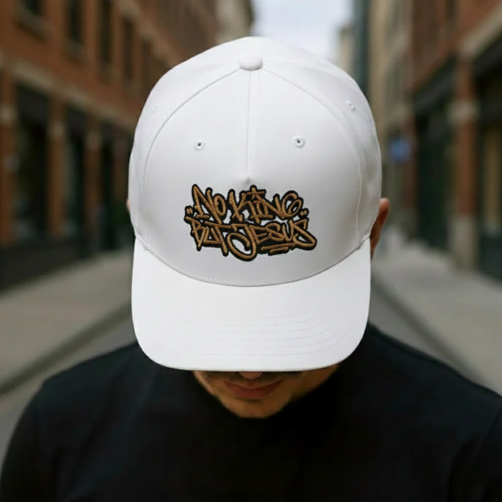 All-white cotton-twill hats with bold, street-culture embroidery that pops. Stitched, never printed.